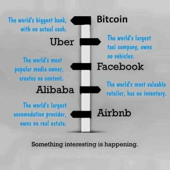 La imagen concluye que algo está pasando: «Facebook, la red social más popular, no genera contenido. Airbnb, el gran proveedor de alojamiento, no posee propiedades. Uber, la gran compañía de taxis, no posee ningún vehículo. Alibaba, la mayor comercializadora, no tiene inventarios,…»